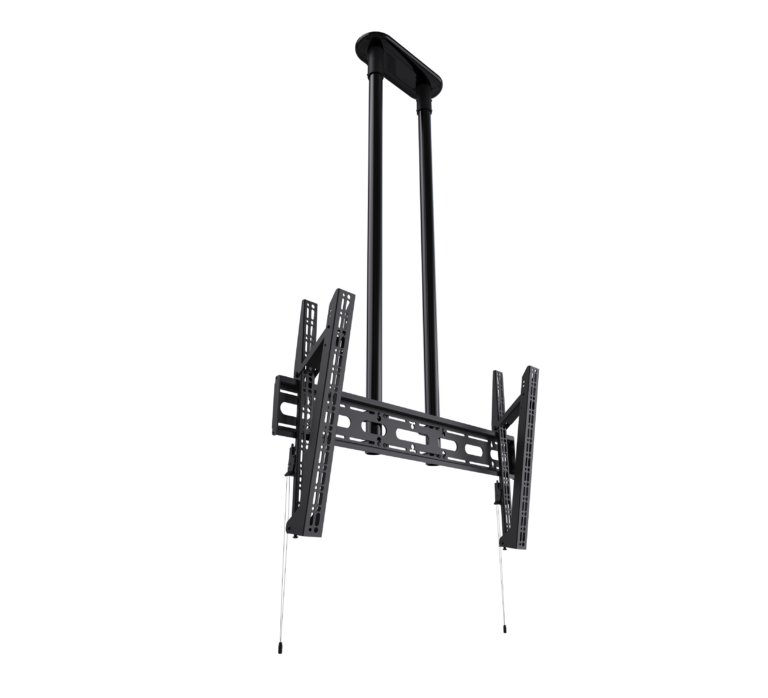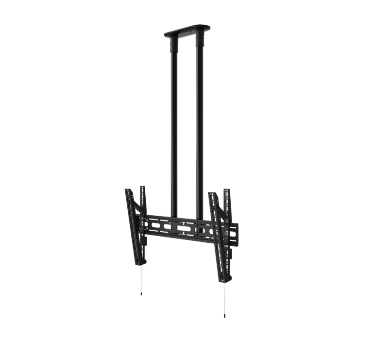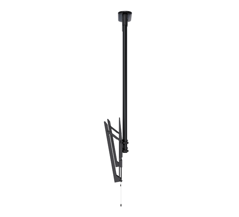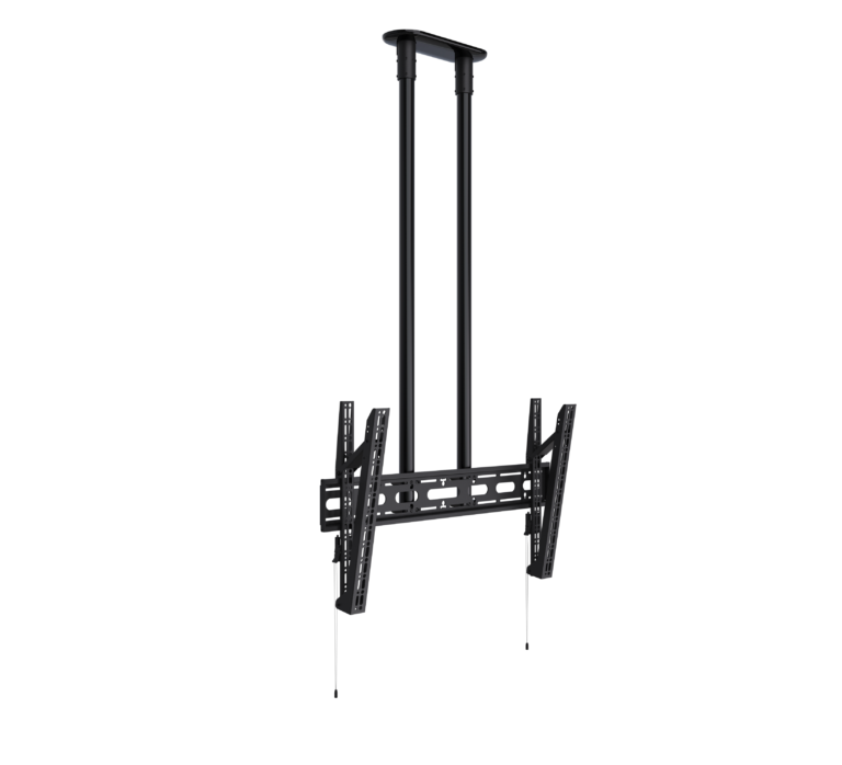 Designed to ceiling mount screens over 65", the BT8449 is an extra-large ceiling mount which is available with a choice of four different drop lengths; 1m, 2m and 3m. The twin pole design and heavy duty steel provides strength and rigidity, allowing for a maximum load of up to 80kg. Other features include a choice of 4 tilt positions from 0° up to 15°, post installation screen alignment and height adjustment screws to help level the screen once mounted. Available with a choice of Black, White or Chrome poles.