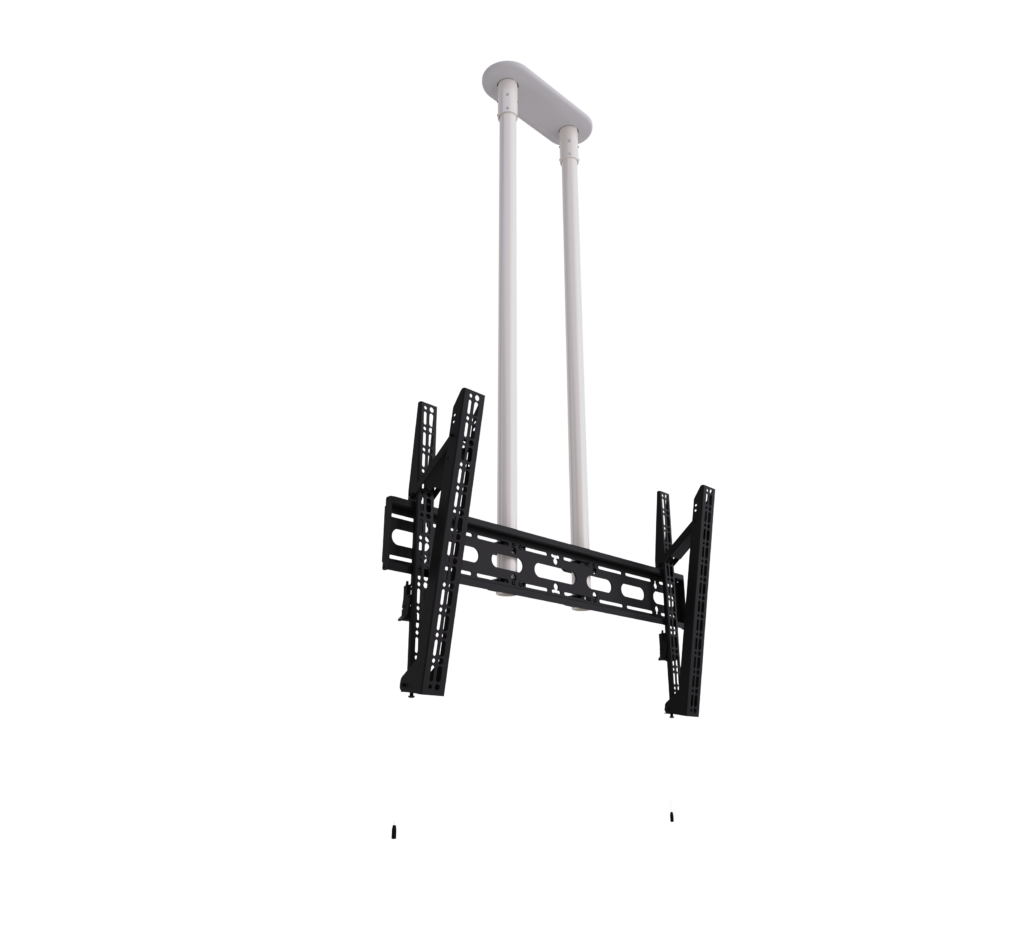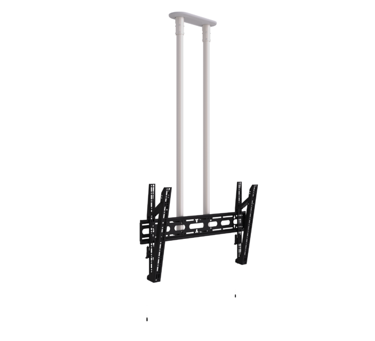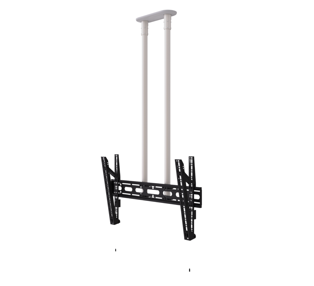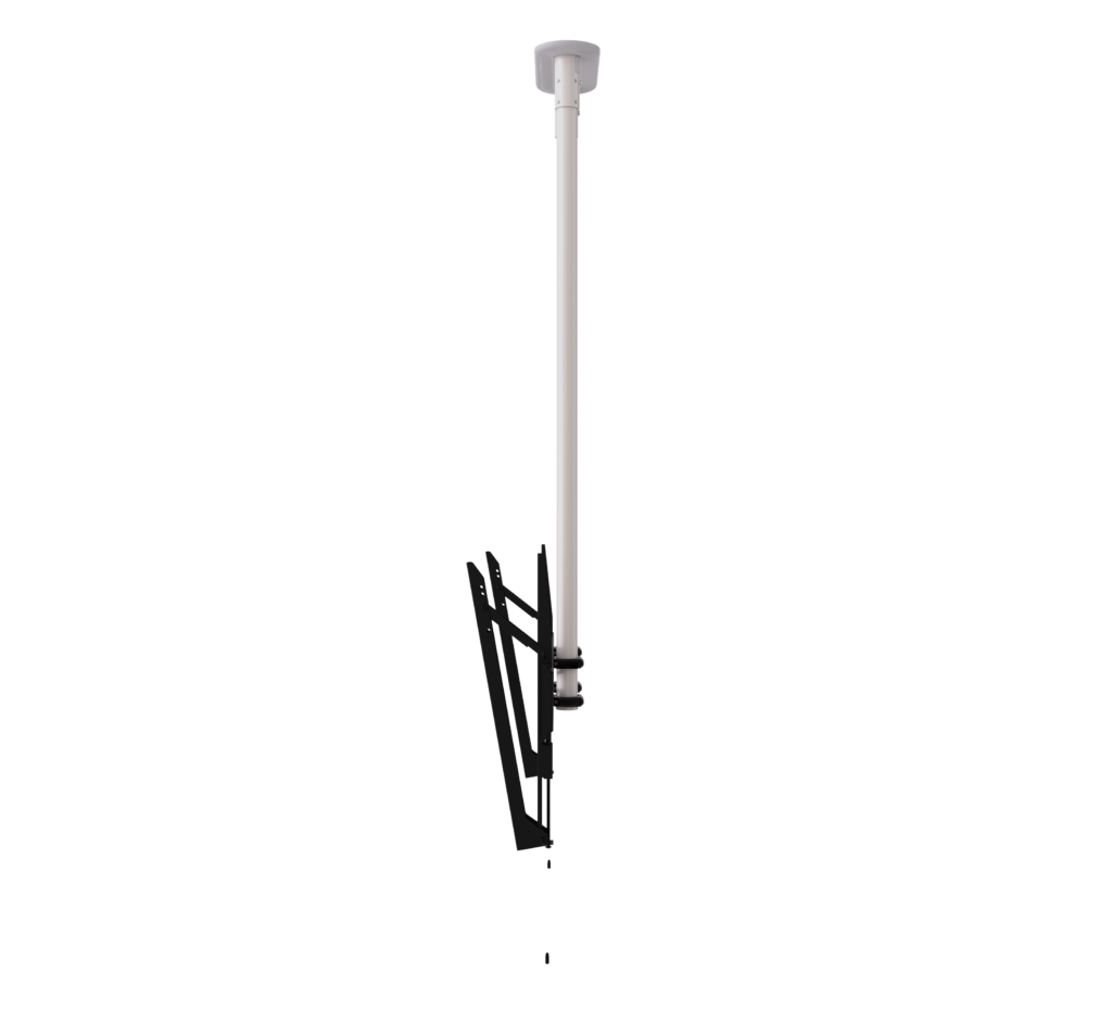 Designed to ceiling mount screens over 65", the BT8449 is an extra-large ceiling mount which is available with a choice of four different drop lengths; 1m, 2m and 3m. The twin pole design and heavy duty steel provides strength and rigidity, allowing for a maximum load of up to 80kg. Other features include a choice of 4 tilt positions from 0° up to 15°, post installation screen alignment and height adjustment screws to help level the screen once mounted. Available with a choice of Black, White or Chrome poles.