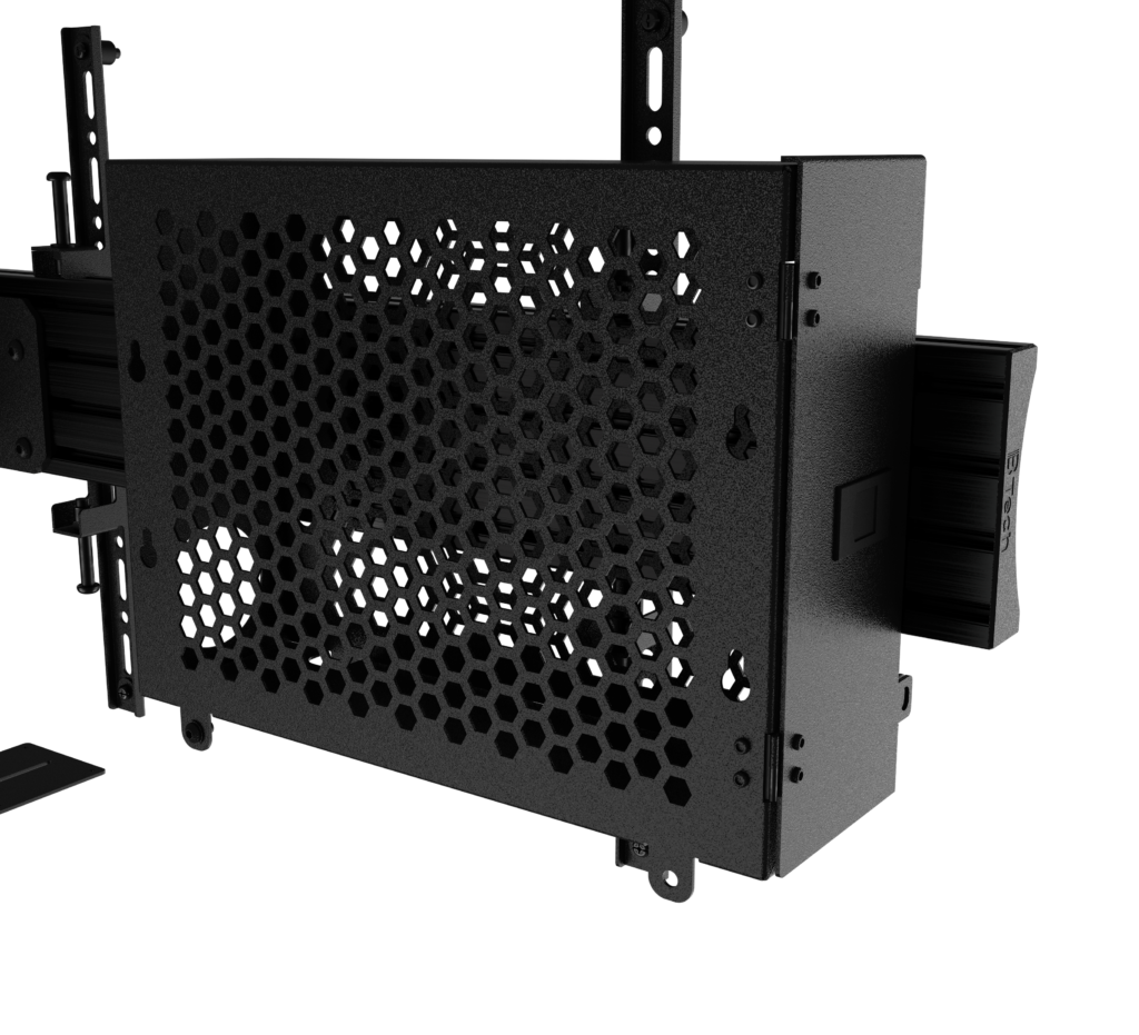 Part of B-Tech’s Momentum Range of display solutions, the BT8557 is a motorised, height-adjustable floor-to-wall stand designed for twin displays up to 65". Its electronic height adjustment system allows for effortless raising and lowering of the screens via a wired control panel, with an adjustment range of up to 650mm that makes the display accessible to a variety of users. Capable of mounting dual screens up to 30kg and featuring a sleek and modern design aesthetic, quick assembly and ease of use. An integrated storage unit at the rear provides convenient space for cable management and AV equipment, making the complete AV setup both neat and practical.