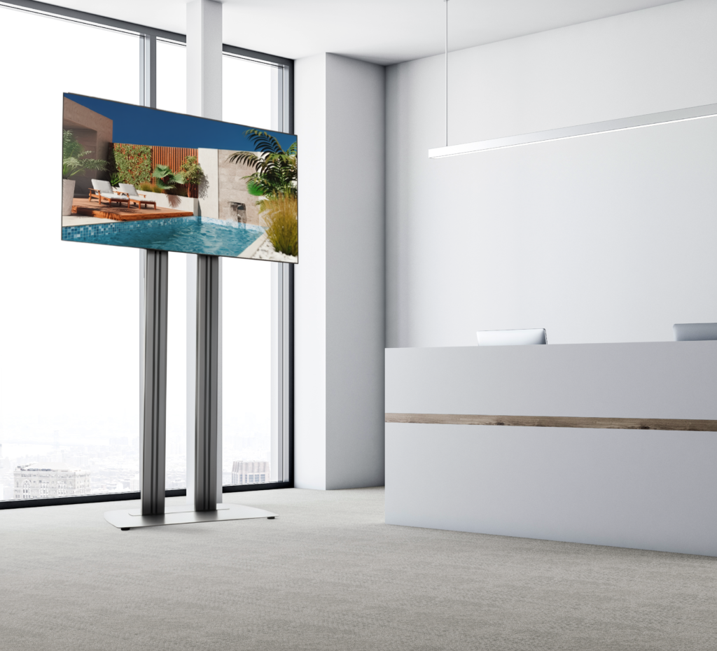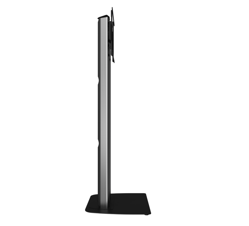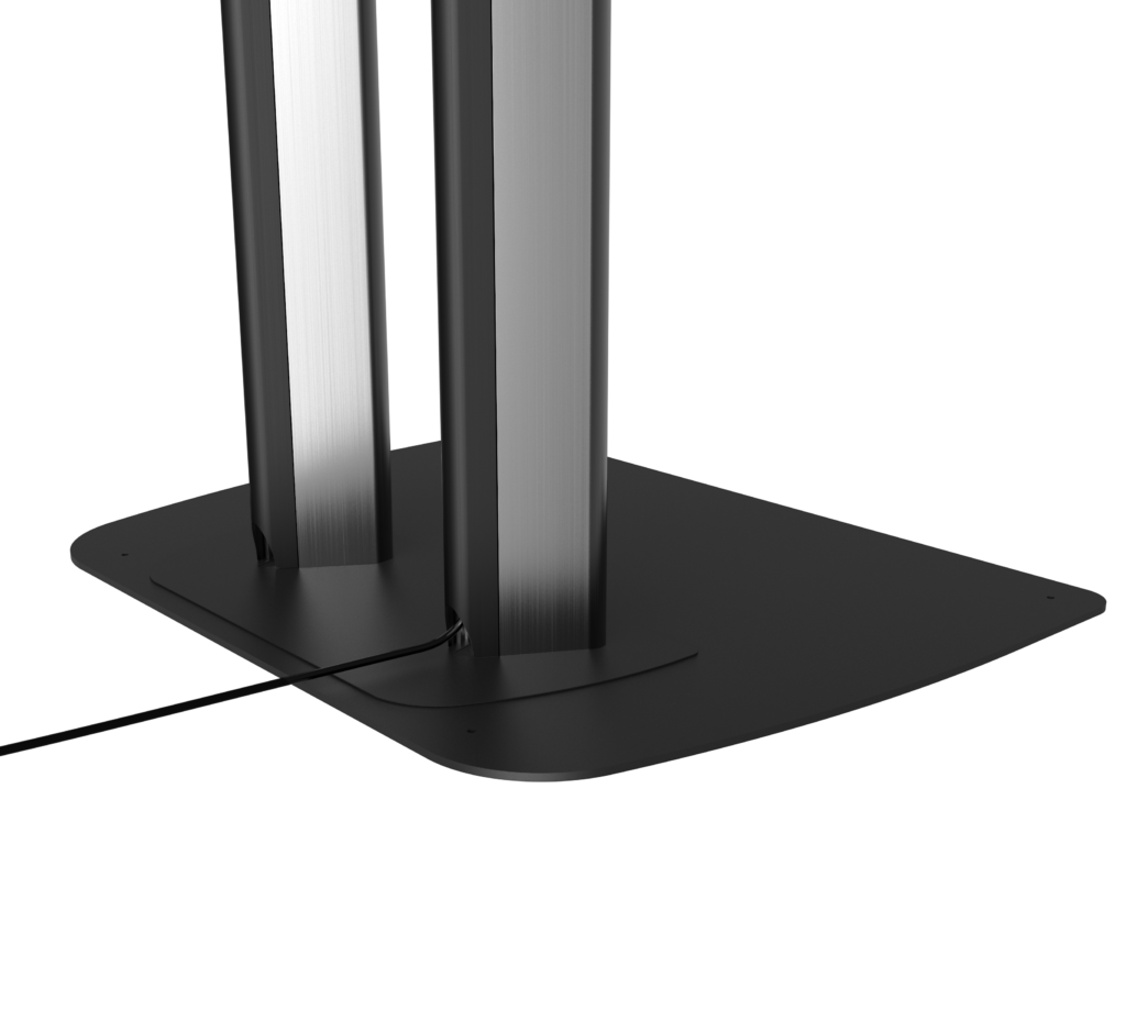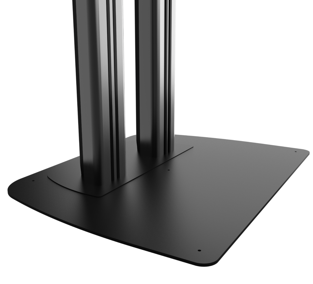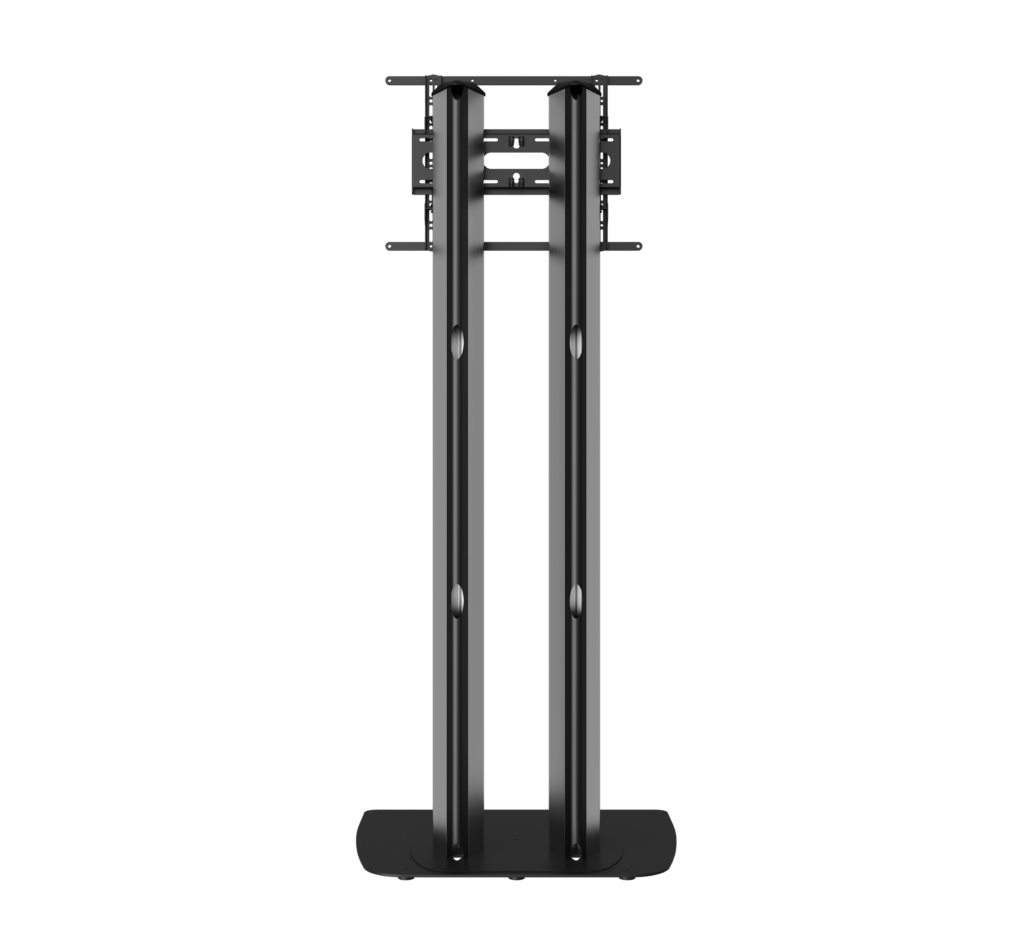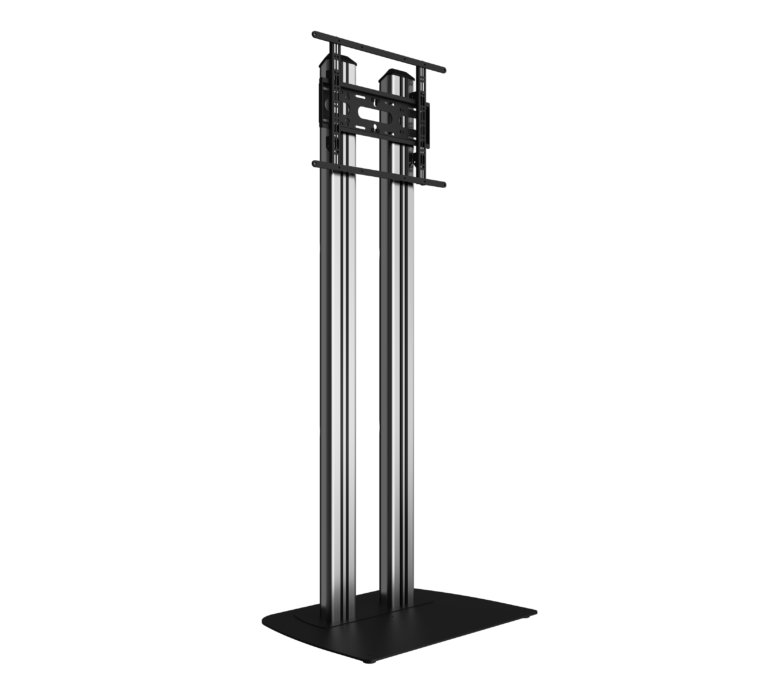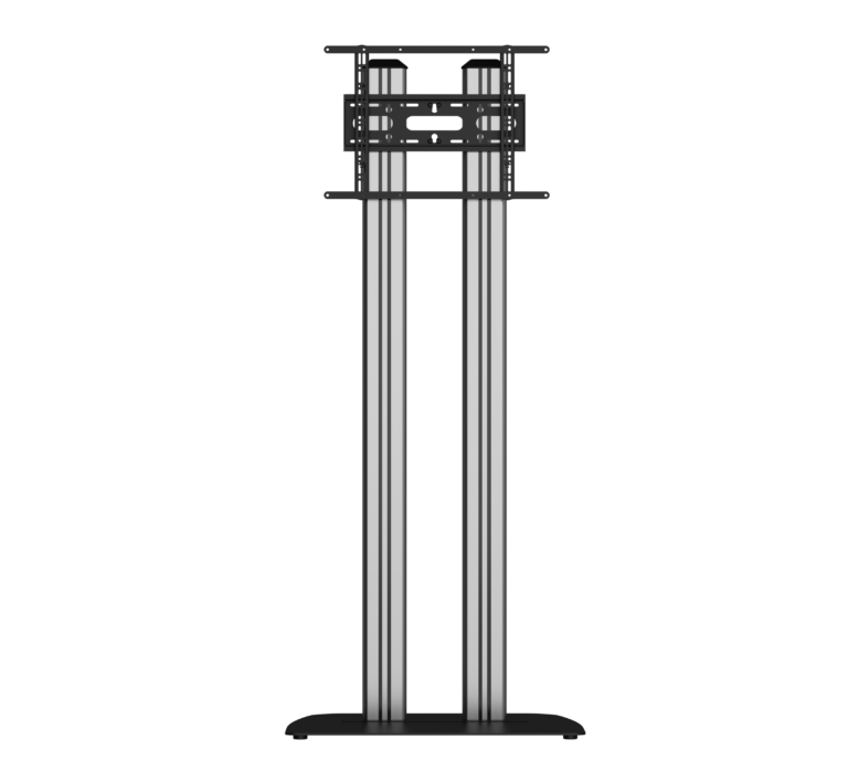 BT8583 is a stylish twin column floor stand designed to mount a large flat screen display. The base features non-marking rubber feet, grab handles for easy handling and a cover plate for improved aesthetics. The screen can be mounted at any height on the 1.8m vertical columns, and B-Tech accessories such as AV shelves can also be fitted directly to the columns.